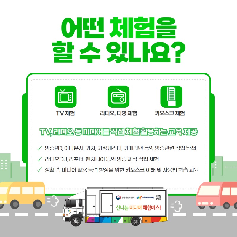 | 지원 규모 | TV, 라디오 등 미디어를 직접 체험 활용하는 교육 제공 - 방송관련 직업 탐색 - 방송 제작 직업 체험 - 키오스크 체험 |