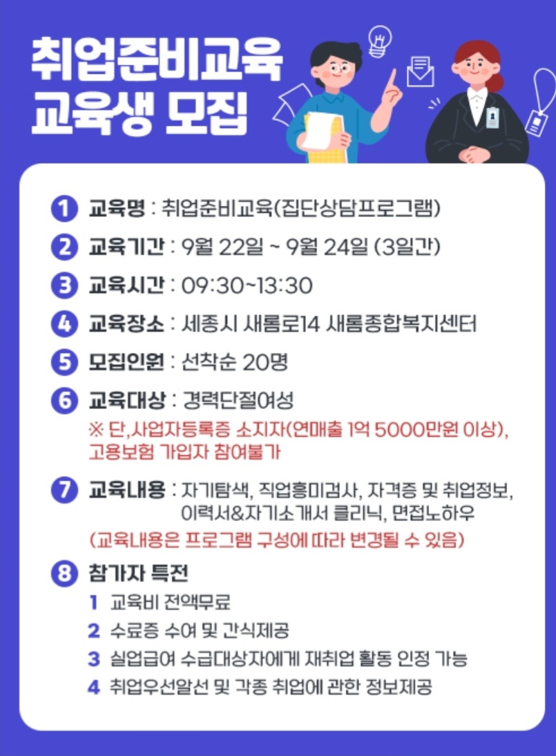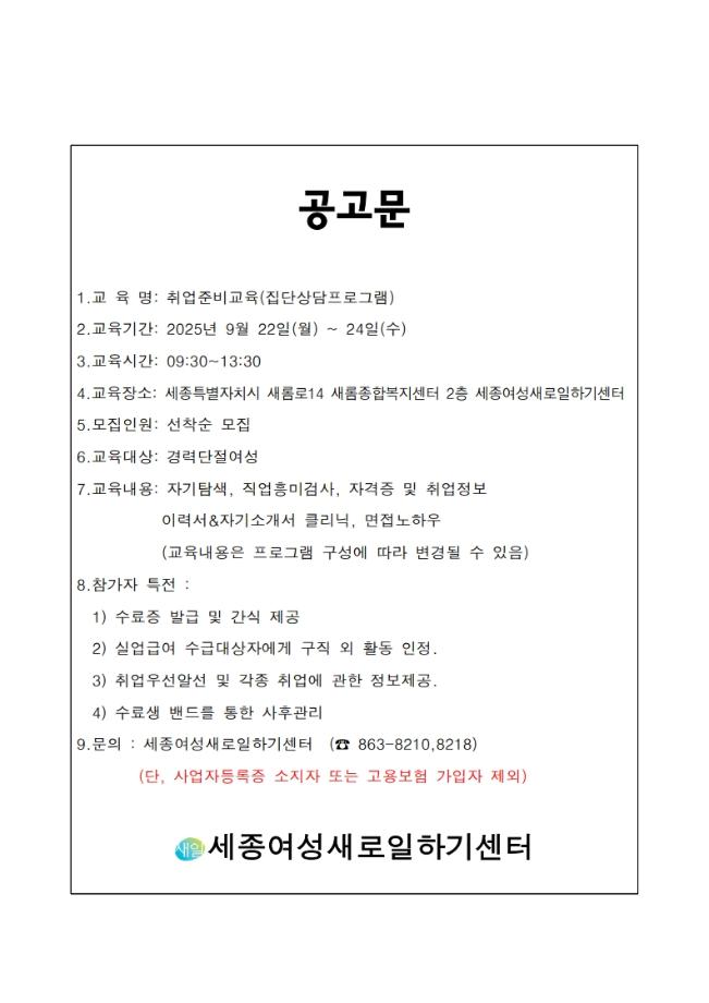 지원 기관 | 세종여성새로일하기센터 | 신청 방법 | ㆍ전화 신청 044) 863-8210, 8218 * 유선으로 선착순 마감 (유선통화 필수) |