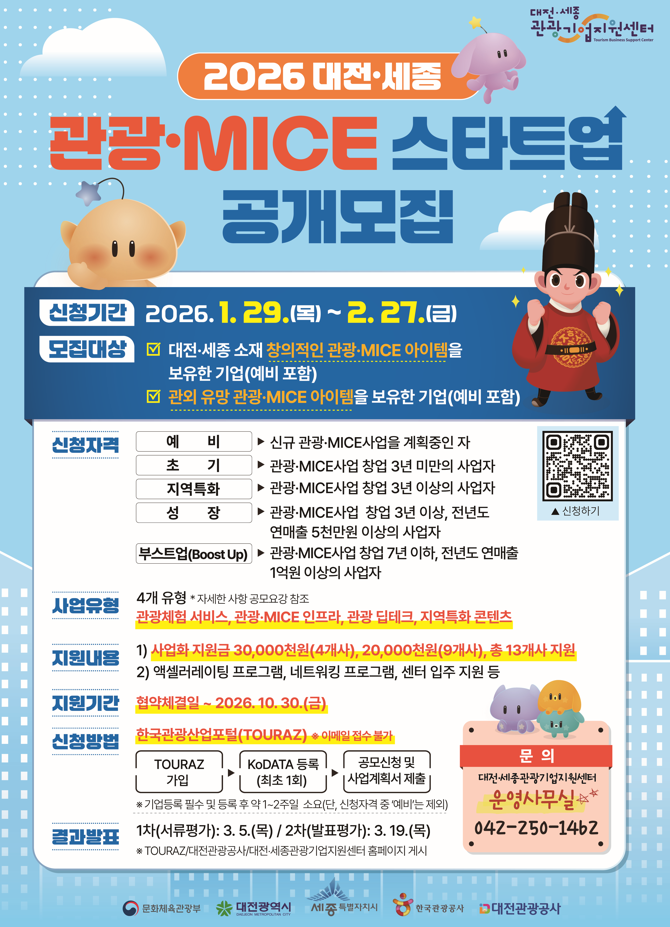 | 정책 소개 | 대전·세종의 관광·MICE업계의 지속 가능한 성장을 위한 2026 대전·세종 관광·MICE 스타트업 지원 공모 참가기업 모집 | 정책 내용 | |