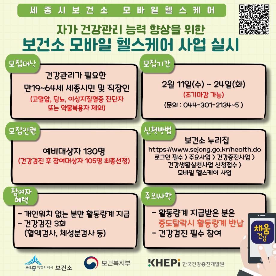 지원 규모 건강검진 3회 / 개인워치 없는분만 활동량계 지급(중도탈락시 반납) 지원 대상 건강관리가 필요한 만19~64세 세종시민 및 관내 직장인