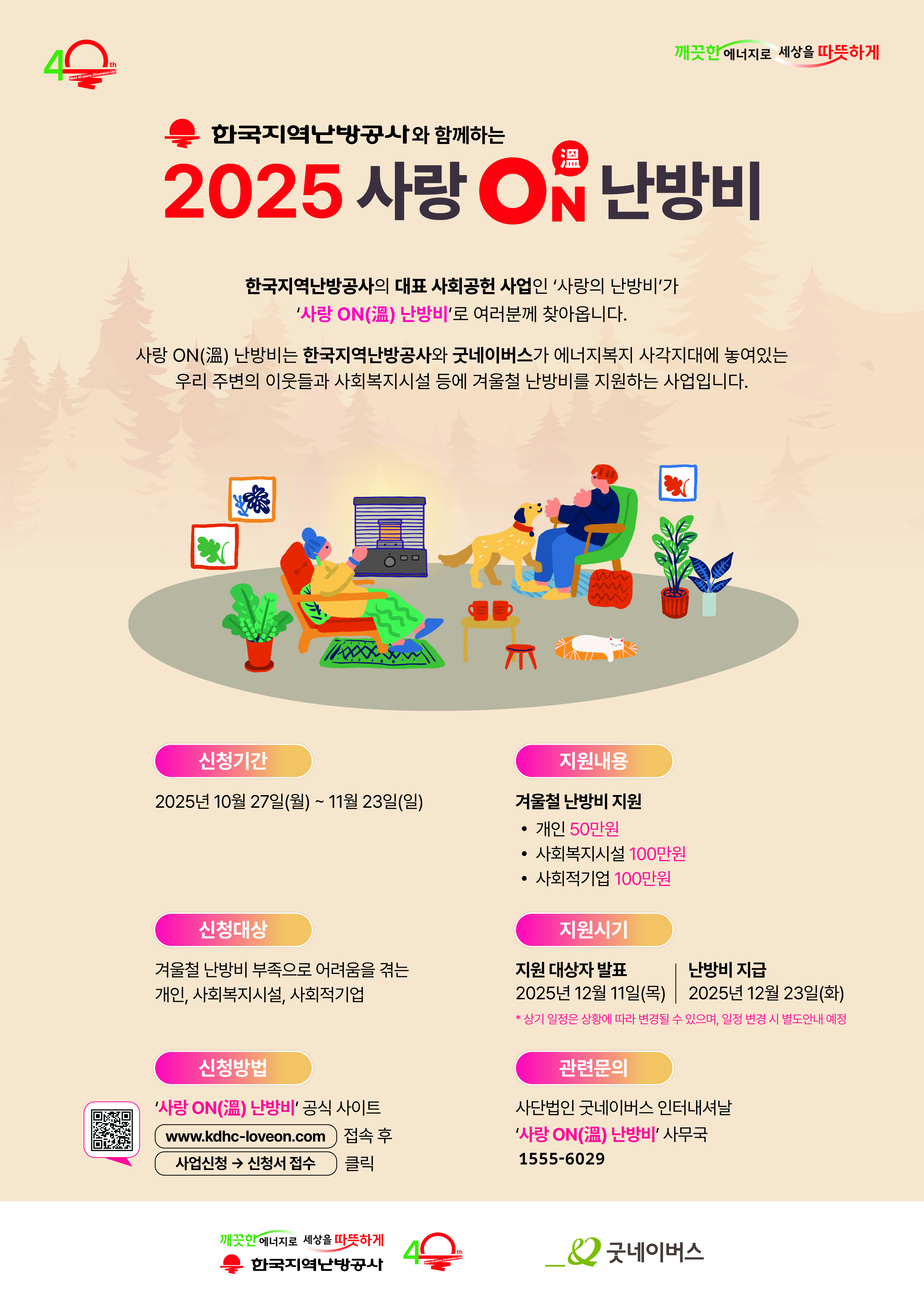 | 지원 기관 | 한국지역난방공사 | 신청 방법 | -신청방법: 사랑 ON(溫) 난방비 공식 사이트를 통해 신청서 접수 *http://kdhc-loveon.com/ -결과발표: 2025. 12. 11. (목) 예정 (홈페이지를 통해 발표 예정) |