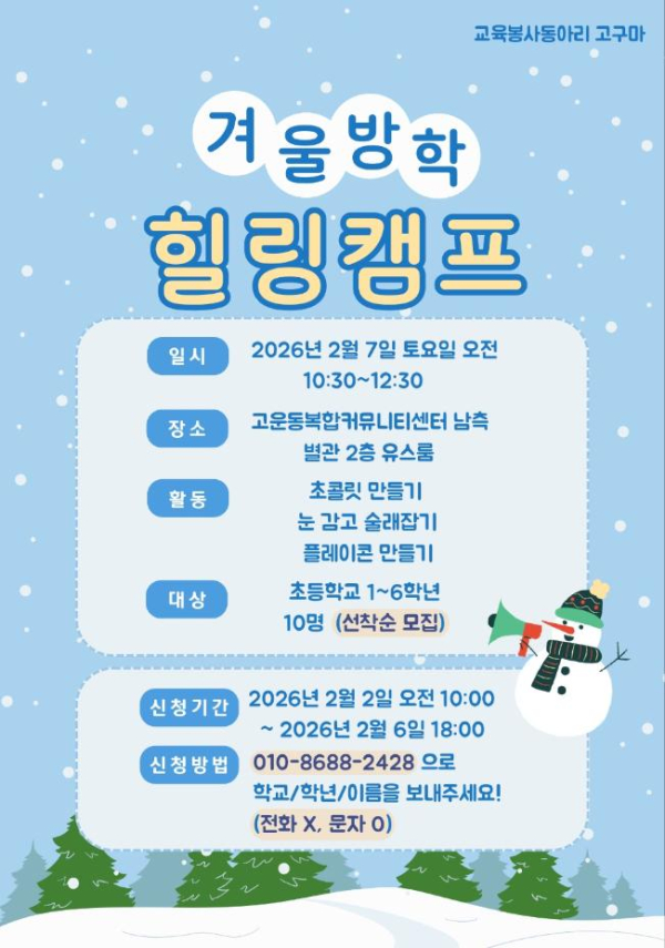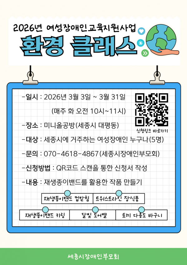전체 377건 현재 페이지 1/63 카드리스트 검색 제목+내용 제목 내용 작성자 검색 2026년 여성장애인교육지원사업 '환경 클래스' 작성일 2026.02.09 조회수 17 2026년 제1회 세종창조경제혁신센터 수요투자포럼 & 수요투자 IR 개최 안내 작성일 2026.02.05 조회수 33 (고운) 교육봉사팀 고구마와 함께하는 겨울방학 힐링캠프 작성일 2026.02.04 조회수 35 AI활용 취업역량 레벨업 작성일 2026.02.04 조회수 38 2026년 새활용 체험교육 프로그램 제안 공모 작성일 2026.02.03 조회수 45 겨울방학 초등학생 대상 '미디어 교실' 프로그램 작성일 2026.01.30 조회수 59 1 2 3 4 5 6 7 8 9 10 1 / 63