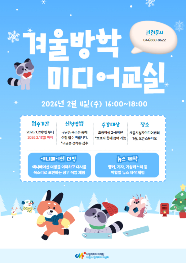 전체 373건 현재 페이지 1/63 카드리스트 검색 제목+내용 제목 내용 작성자 검색 겨울방학 초등학생 대상 '미디어 교실' 프로그램 작성일 2026.01.30 조회수 20 2026년 싱싱문화관 2월 쿠킹 클래스 작성일 2026.01.28 조회수 33 2026년 "설날 연휴 꿈밥 꾸러미" 신청 작성일 2026.01.27 조회수 29 2026년 상반기 한국어 수업강좌 안내 작성일 2026.01.26 조회수 32 세종시민과 함께하는 글로벌 요리교실 작성일 2026.01.22 조회수 51 결혼이민자 통번역서비스 사업 소수언어 통번역사 모집 작성일 2026.01.22 조회수 47 1 2 3 4 5 6 7 8 9 10 1 / 63