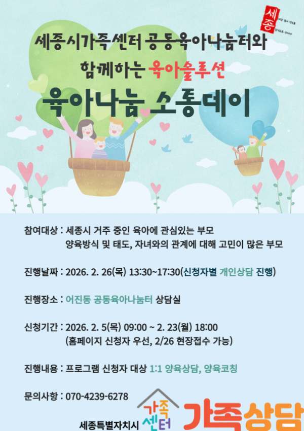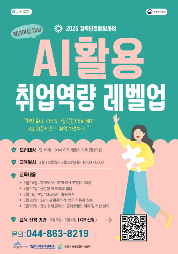 전체 392건 현재 페이지 3/66 카드리스트 검색 제목+내용 제목 내용 작성자 검색 2026 세계 여성의 날 기념 컨퍼런스 작성일 2026.02.12 조회수 105 청년여성 AI활용 취업역량 레벨업 작성일 2026.02.10 조회수 109 공동육아나눔터와 함께하는 육아솔루션-육아나눔 소통데이 작성일 2026.02.10 조회수 95 2026년 여성장애인교육지원사업 '환경 클래스' 작성일 2026.02.09 조회수 100 2026년 제1회 세종창조경제혁신센터 수요투자포럼 & 수요투자 IR 개최 안내 작성일 2026.02.05 조회수 115 (고운) 교육봉사팀 고구마와 함께하는 겨울방학 힐링캠프 작성일 2026.02.04 조회수 95 1 2 3 4 5 6 7 8 9 10 3 / 66