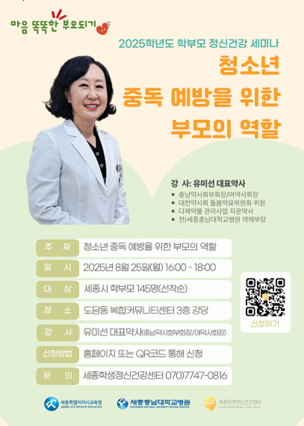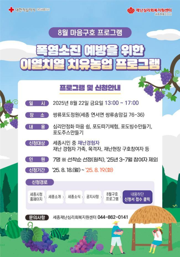 전체 336건 현재 페이지 9/56 카드리스트 검색 제목+내용 제목 내용 작성자 검색 [세종발달장애인지원센터] 장애인식개선 행사 "당신을 안아줄게요" 작성일 2025.08.21 조회수 74 [세종학생정신건강센터] "청소년 중독 예방을 위한 부모의 역할" 작성일 2025.08.20 조회수 94 [세종시청 기업지원과] "제5회 사회적가치 나눔축제 숲으로" 함께 해요~ 작성일 2025.08.19 조회수 99 [세종시교육청ESD거버넌스 파트너쉽분과]스스로 생각하는 법과 스스로 실패하는 법... 작성일 2025.08.18 조회수 202 [재난심리회복지원센터]2025년 8월 마음구호 프로그램 - 폭염소진 예방을 위한 이... 작성일 2025.08.18 조회수 103 [세종시장애인복지관] 2025년 당사자교육-"디지털 성범죄 예방교육" 수강생 모집공고 작성일 2025.08.14 조회수 111 4 5 6 7 8 9 10 11 12 13 9 / 56