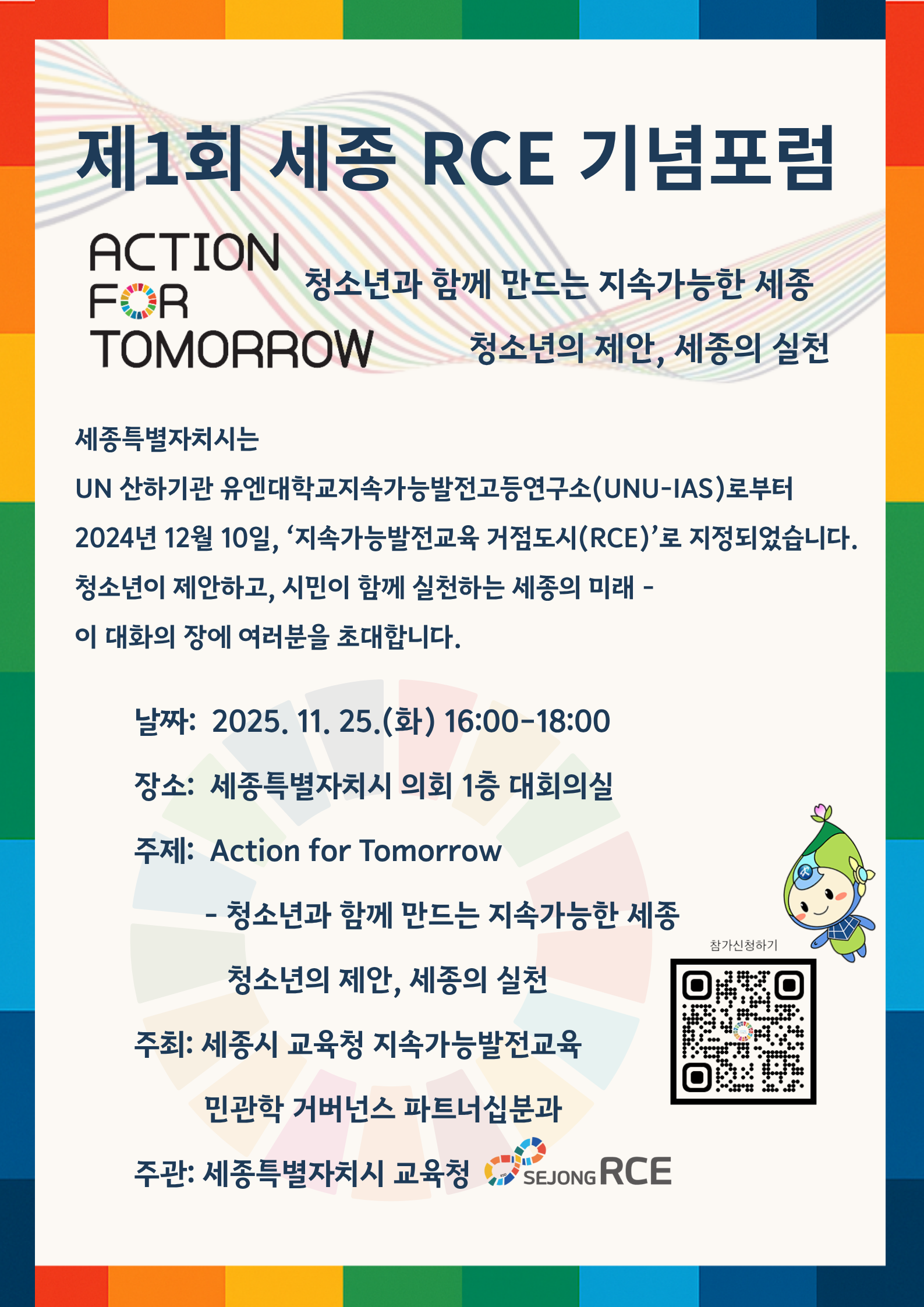 세종특별자치시가 UN 산하기관 **UNU-IAS로부터 RCE(지역 지속가능발전교육 거점도시)**로 공식 지정된 것을 기념하여 세종 시민·관·학·기업이 함께 아이들이 바라는 미래 과제를 실현하기 위한 역할을 논의하는 포럼을 개최합니다.