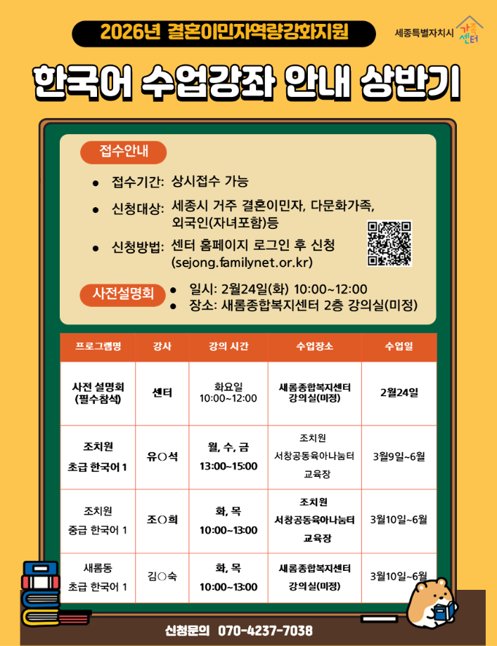 여성정책 > 기관단체 소식 여성정책 > 기관단체 소식 관한 표입니다. 2026년 상반기 한국어 수업강좌 안내 작성자 공간매니저 작성일2026.01.26 조회수 33 ▶지원하기: https://sejong.familynet.or.kr/ 첨부파일 920_BBS_0000163718suZJ91P0.png (161.9 KB) 목록으로