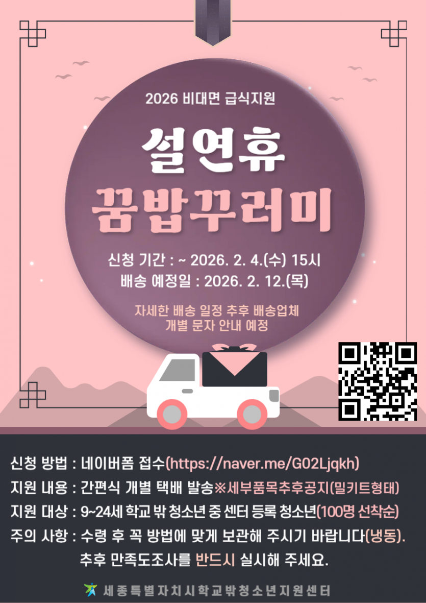 여성정책 > 기관단체 소식 여성정책 > 기관단체 소식 관한 표입니다. 2026년 "설날 연휴 꿈밥 꾸러미" 신청 작성자 공간매니저 작성일2026.01.27 조회수 29 ▶지원하기: https://sj1388.or.kr/bbs/board.php?bo_table=news1&wr_id=1162 첨부파일 thumb-dd0a45051f97843442b1001ef41810e5_1769046488_3991_835x1181.png (915.9 KB) 목록으로