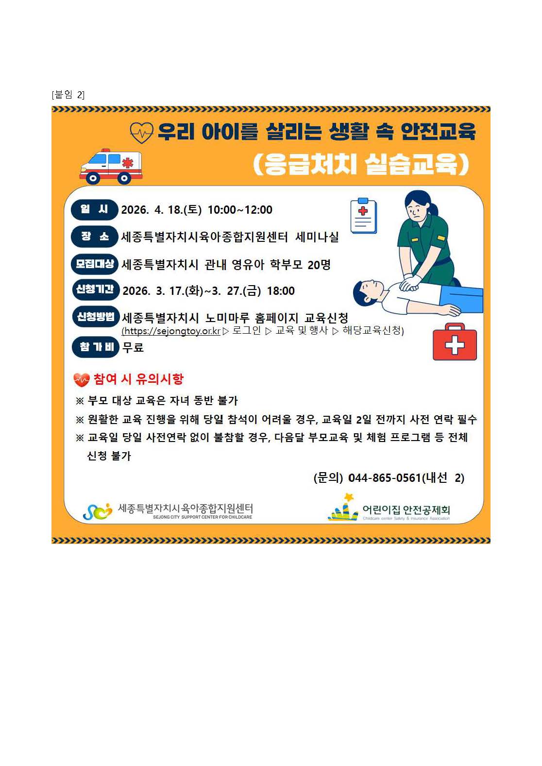 | [세종특별자치시육아종합지원센터] 우리 아이를 살리는 생활 속 안전교육(응급처치 실습교육) 홍보 | |