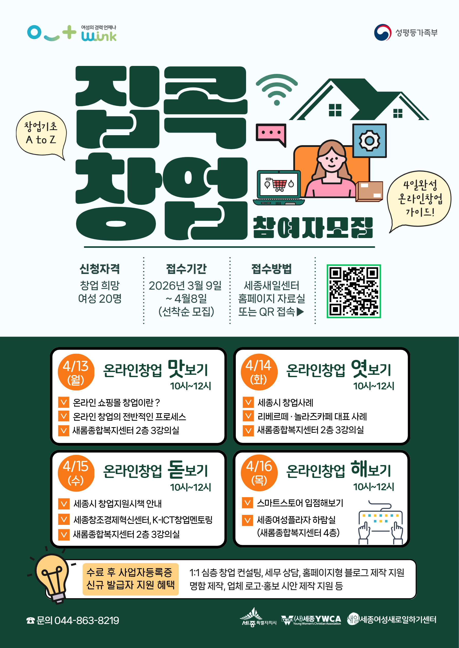 여성정책 > 기관단체 소식 여성정책 > 기관단체 소식 관한 표입니다. 2026 집콕창업 참여자 모집 작성자 공간매니저 작성일2026.04.02 조회수 5 ▶ 신청하기 : https://naver.me/FhfzCxpW 첨부파일 2026_집콕창업_웹자보.png (405.2 KB) 목록으로