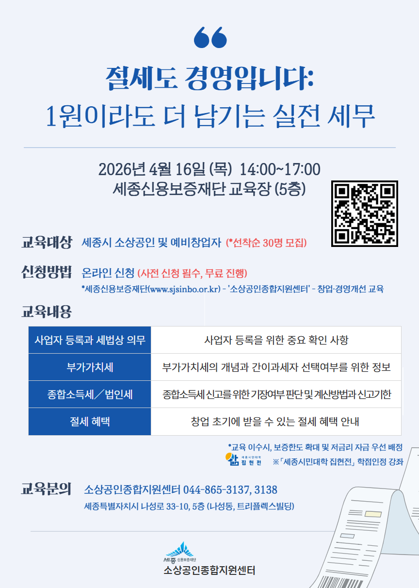 | [세종소상공인종합지원센터] '26년4월 소상공인 점프업아카데미 '절세도 경영입니다' 안내 | |