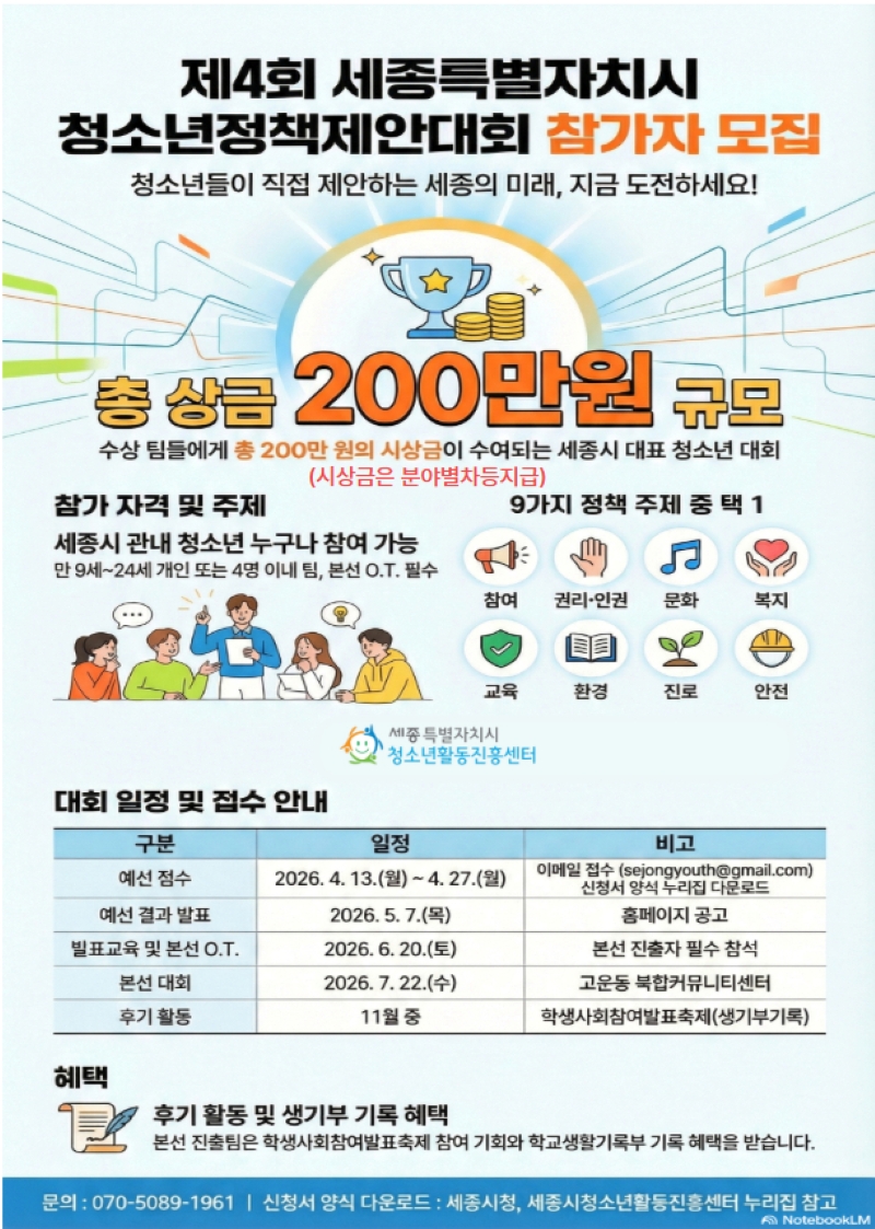 | [세종시청소년활동진흥센터] 제4회 세종특별자치시 청소년정책제안대회 참가자 모집 공고 | |