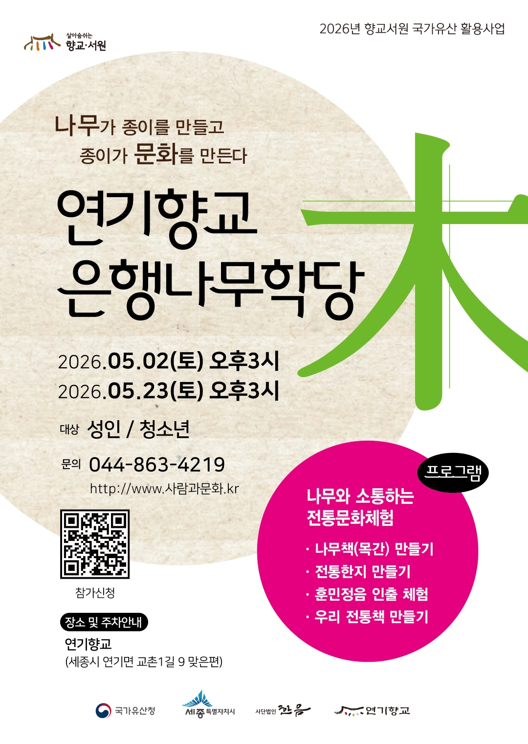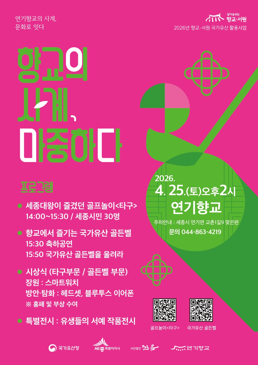 1. 향교의 사계, 마중하다 - 일 시: 2026.4.25.(토) 14:00~16:00- 장 소: 연기향교(세종시 연기면 교촌1길 맞은편) - 행사내용: 타구(골프놀이), 국가유산 골든벨, 서예 작품전시, 시상식