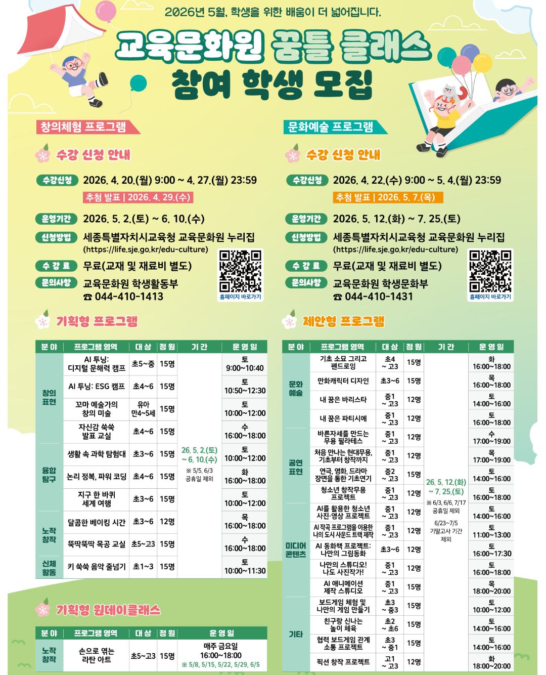 | [세종시교육청 교육문화원] 꿈틀 클래스 참여 학생 모집 | |
