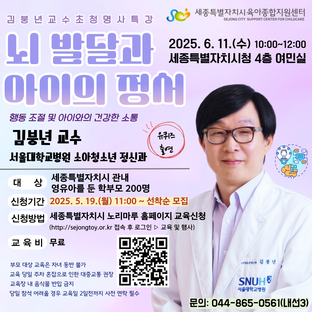 여성정책 > 기관단체 소식 여성정책 > 기관단체 소식 관한 표입니다. [세종시육아종합지원센터]감붕년교수초청명사특강 *뇌 발달과 아이의 정서 * 작성자 공간매니저 작성일2025.05.12 조회수 248 첨부파일 명사특강_「뇌발달과_아이의_정서」.png (662.8 KB) 목록으로