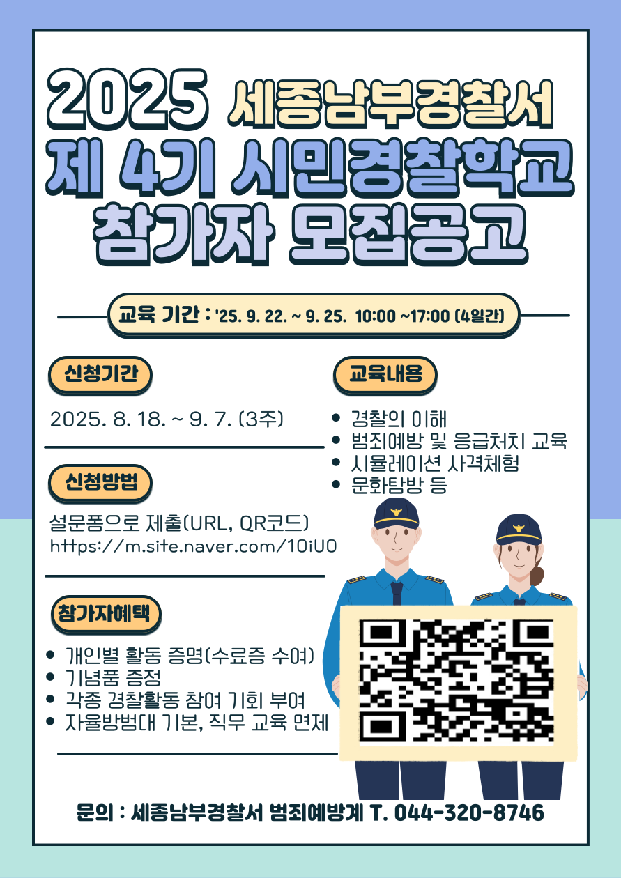 여성정책 > 기관단체 소식 여성정책 > 기관단체 소식 관한 표입니다. [세종남부경찰서] 25년 "4기 시민경찰학교 모집" 공고 작성자 공간매니저 작성일2025.08.14 조회수 119 참여신청링크 https://m.site.naver.com/10iU0 첨부파일 25년_시민경찰학교_4기_모집공고_포스터.png (230.2 KB) 목록으로