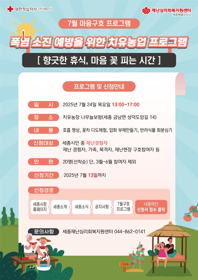 2025년 7월 마음구호 프로그램 참가자 추가모집 1. 프로그램 개요 - 일 시 : 2025. 7. 24.(목) 13:00~17:00 - 장 소 : 치유농장 나무늘보팜(세종 금남면 성덕도암길 14) - 대상자 : 재난경험자(연령무관) ※ 미성년자 신청시 보호자 동반 신청 필수 / 선착순 선정(원칙, '25년 3~6월 참여자 제외) - 참가비 : 무료 - 내 용 : 폭염으로 인한 소진(번아웃) 예방을 위한 호흡명상과 치유농업 프로그램 체험