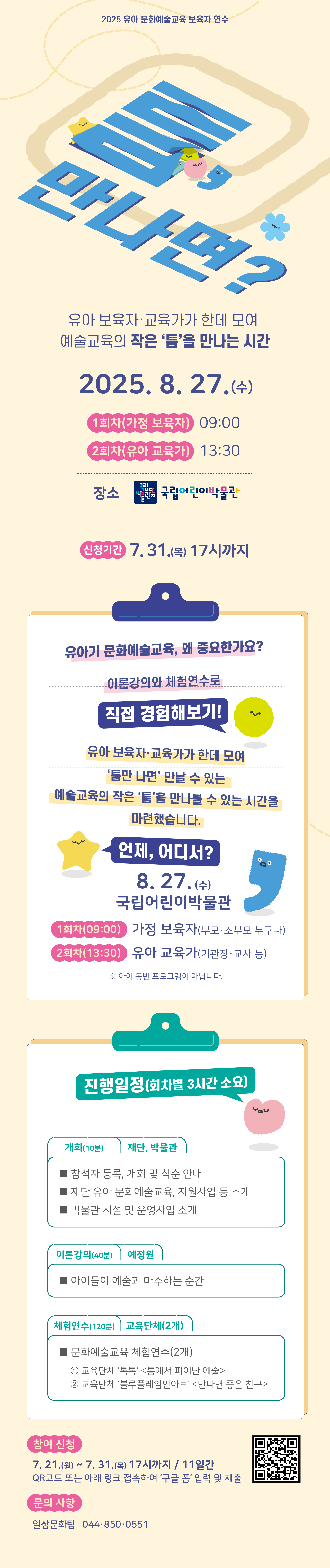 2025년 유아 문화예술교육 보육자 연수 <틈,만나면?>유아 보육자,교육가가 한데 모여 예술교육의 작은 '틈'을 만나는 시간 일시: 2025. 8. 27.(수) 1회차(가정 보육자) 09:00 2회차(유아 교육가) 13:30 장소: 국립어린이박물관 신청기간: 7. 31.(목) 17시까지 문의 044-850-0551