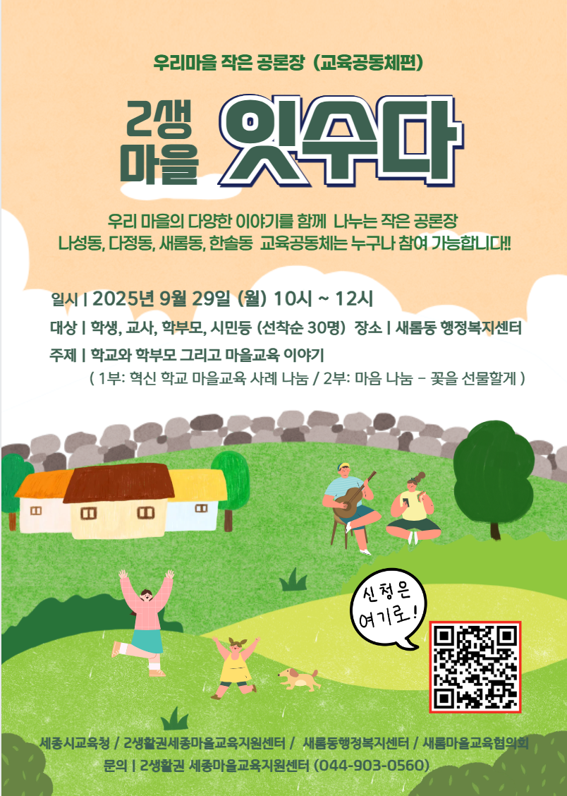 세종시교육청 2생활권세종마을교육지원센터와 교육공동체가 함께 마을에 관한 이야기를 나눠보는 시간을 마련하였습니다. 2셍활권 나성동, 다정동, 새롬동, 한솔동 학생, 학부모, 시민들의 많은 참여 부탁드립니다.