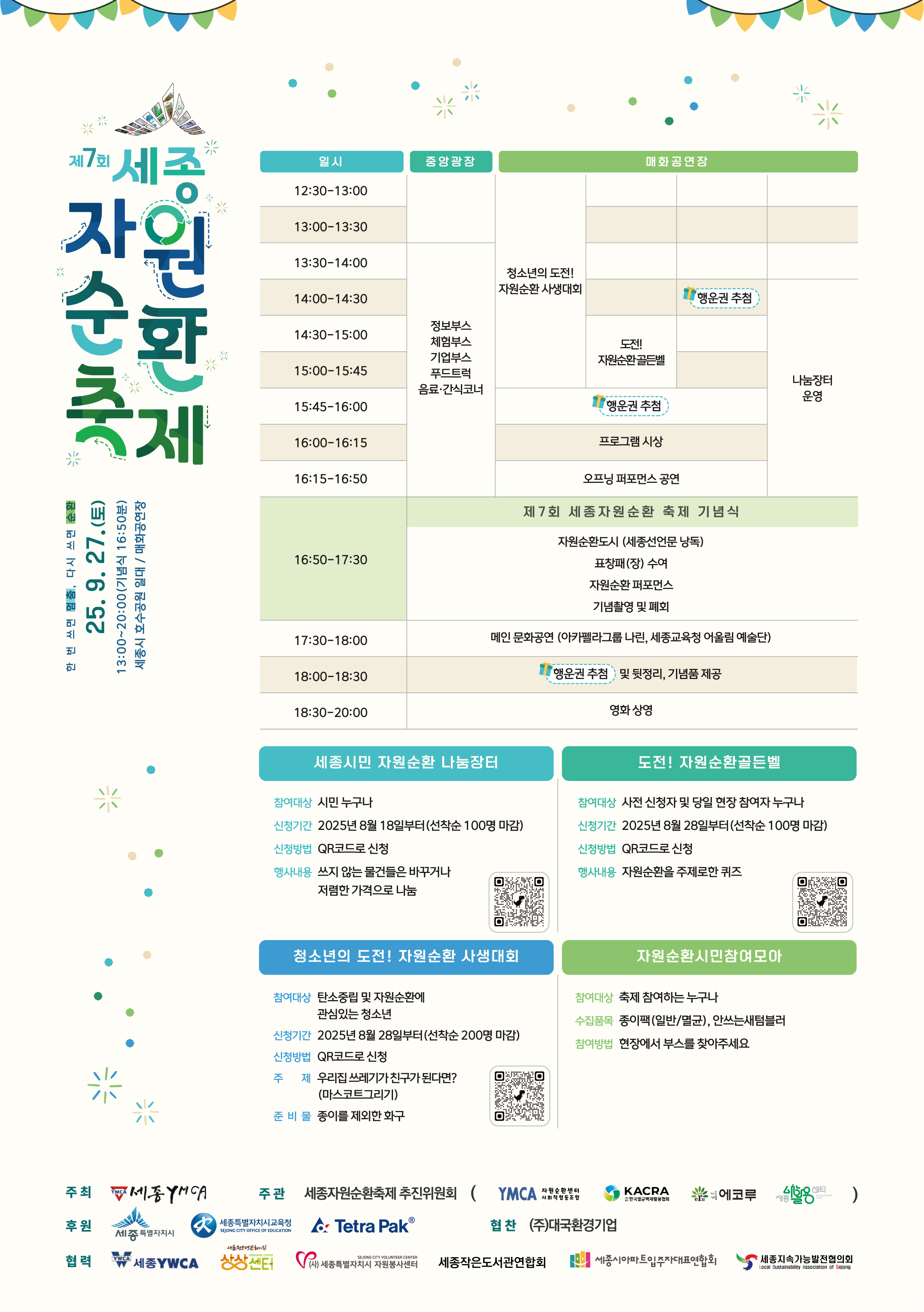 "제17회 자원순환의 날"을 기념하여 자원순환의 가치를 확산하고 시민들이 일상 속 실천 활동에 동참할 수 있도록 다양한 체험과 문화행사를 추진하고자 제7회 세종자원순환축제를 개최합니다. |