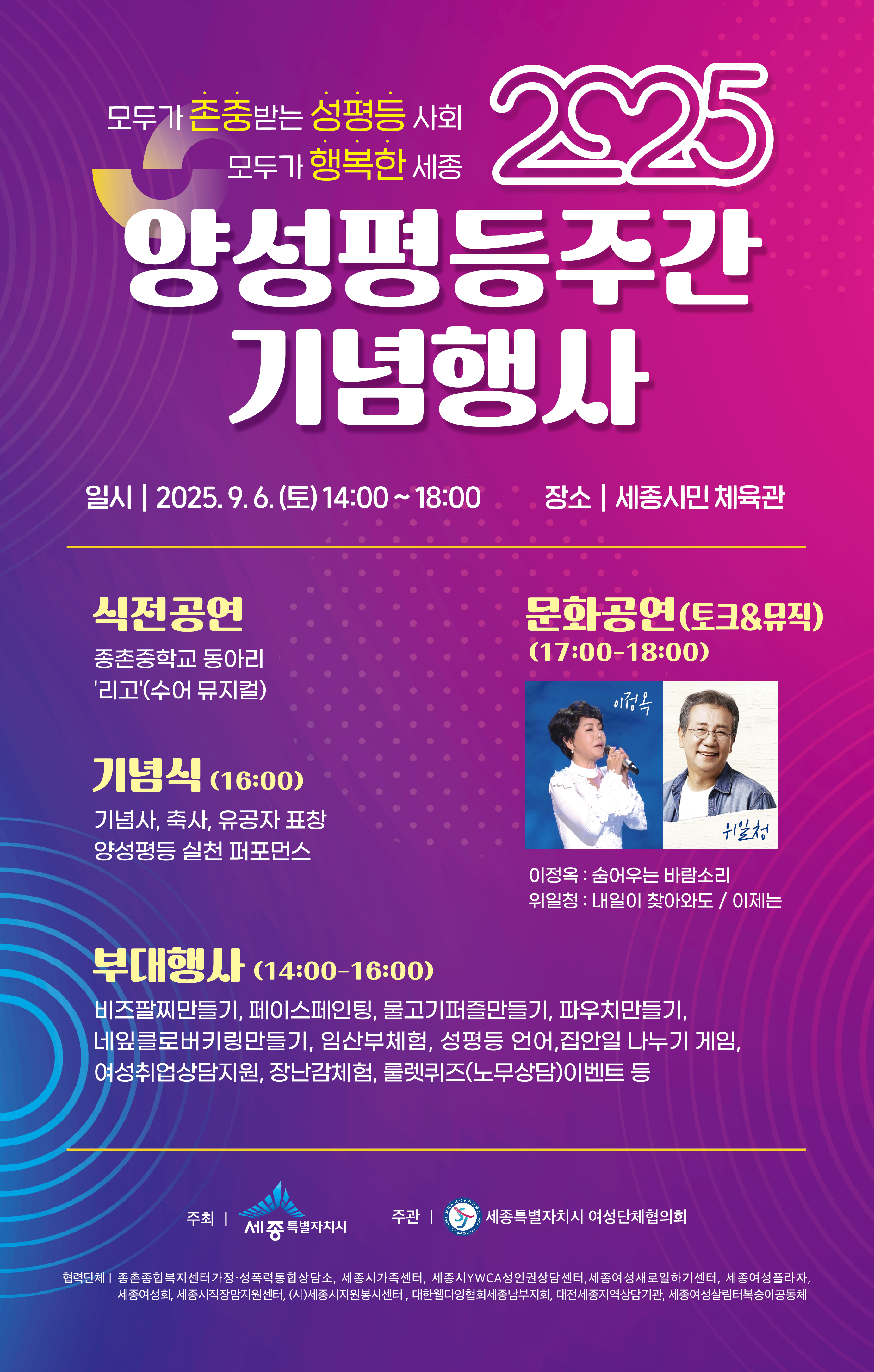 여성정책 > 기관단체 소식 여성정책 > 기관단체 소식 관한 표입니다. [세종특별자치시 여성단체협의회] "2025년 양성평등주간 기념행사" 개최 작성자 공간매니저 작성일2025.08.29 조회수 122 첨부파일 양성평등주간_기념행사_홍보물.jpeg (3.7 MB) 목록으로
