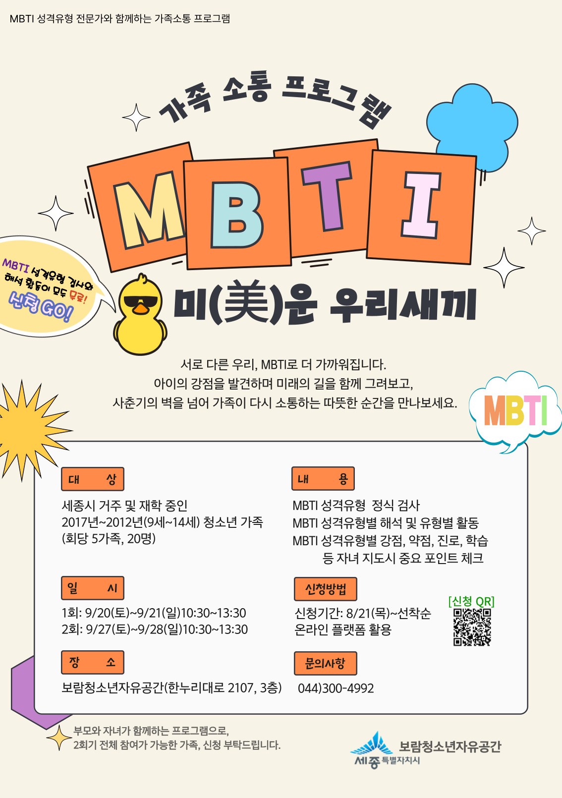 | [세종특별자치시 보람청소년자유공간] MBTI 성격유형 전문가와 함께하는 가족 소통 프로그램 ‘미(美)운 우리 새끼’ | |