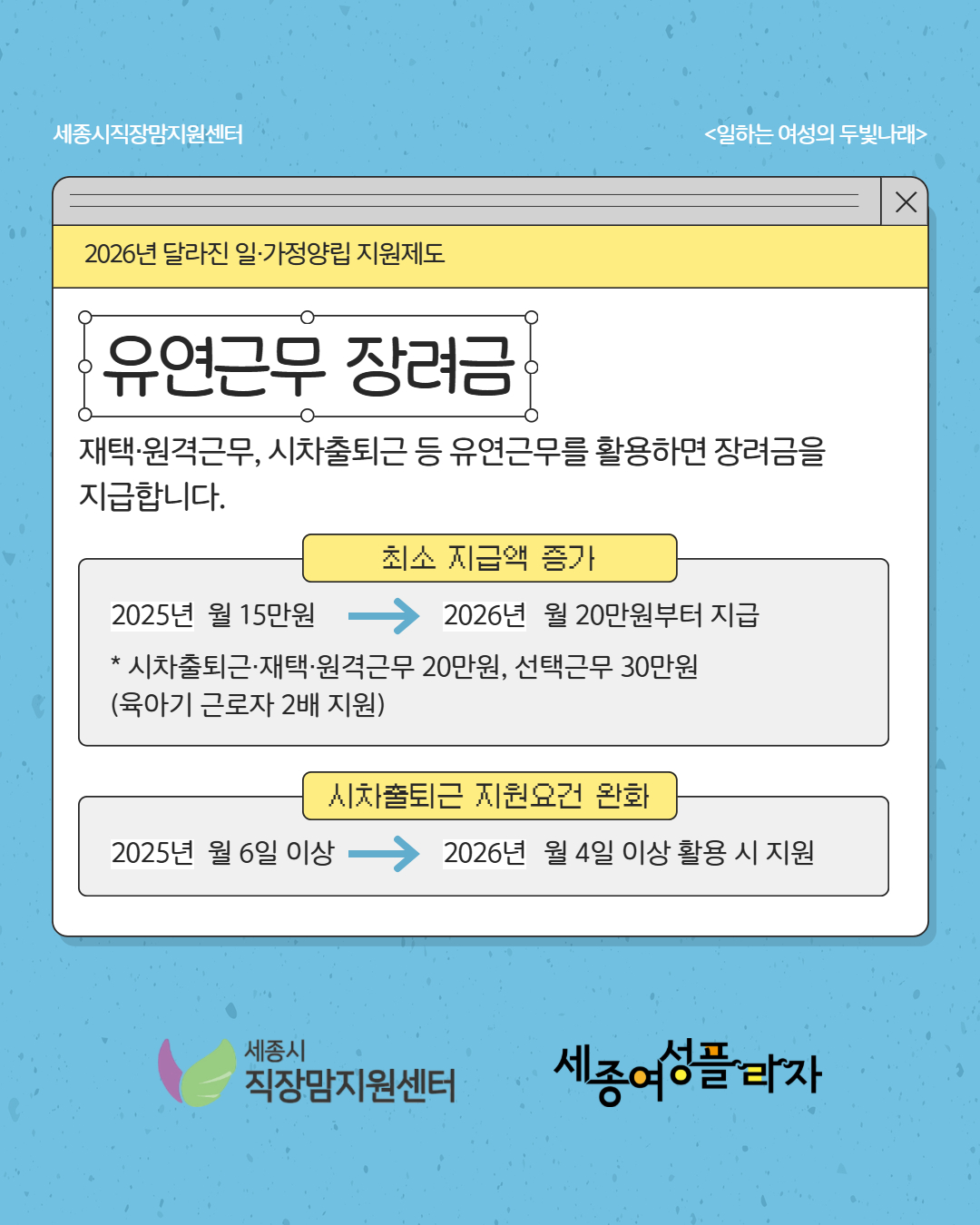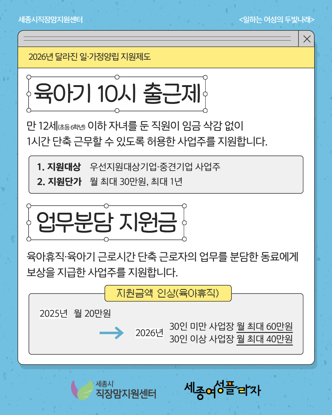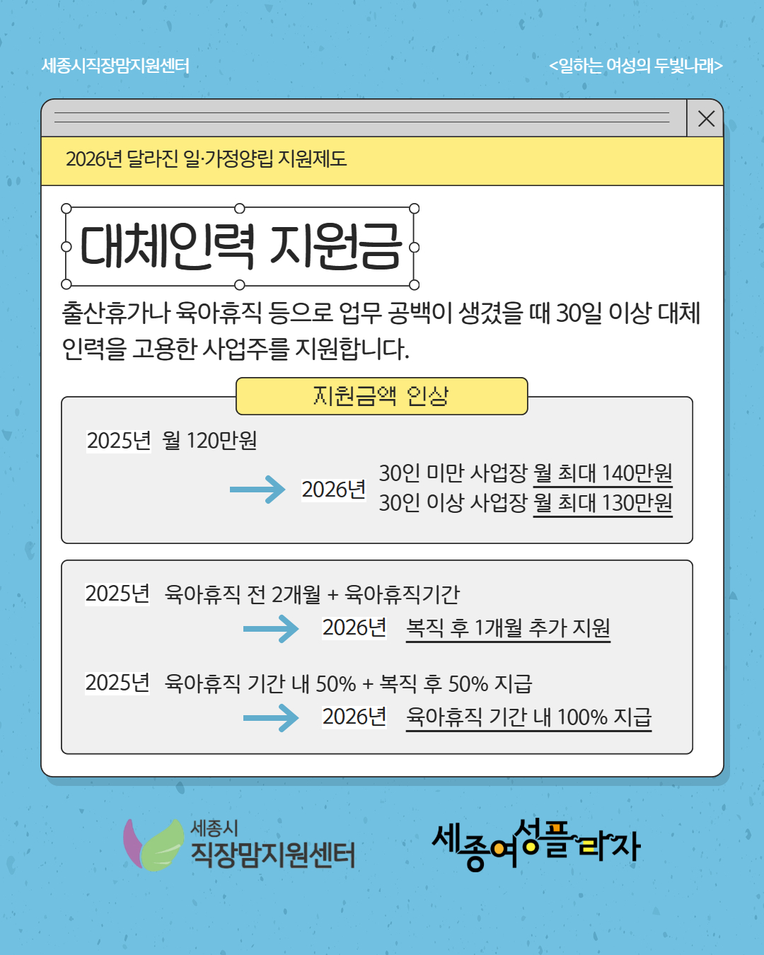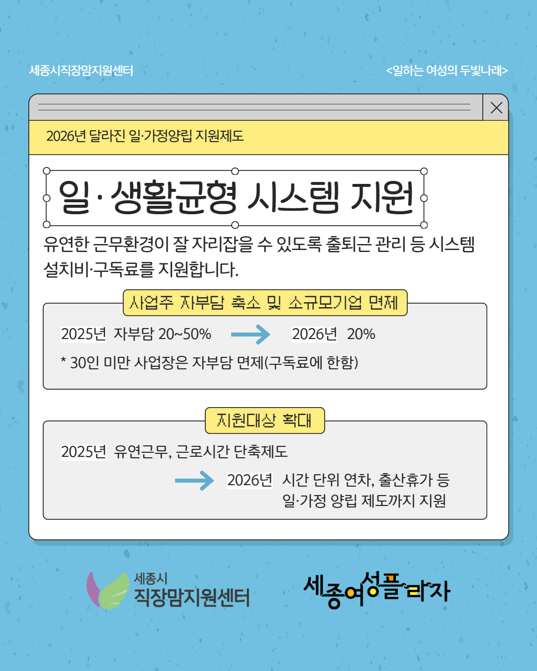일,생활균형소식 일,생활균형소식 관한 표입니다. [사업주지원]2026 달라진 일가정양립지원제도_사업주 편 작성자 관리자 작성일2026.04.03 조회수 181 - 공지사항 입니다. 첨부파일 인스타_2026_달라진_일가정양립지원제도_사업주_편_1.jpg (532.7 KB) 인스타_2026_달라진_일가정양립지원제도_사업주_편_2.jpg (453.8 KB) 인스타_2026_달라진_일가정양립지원제도_사업주_편_3.jpg (446.2 KB) 인스타_2026_달라진_일가정양립지원제도_사업주_편_4.jpg (439.7 KB) 인스타_2026_달라진_일가정양립지원제도_사업주_편_5.jpg (453.0 KB) 목록으로 다음글 2026 하반기 개정사항_단기 육아휴직 제도 신설 이전글 2026 달라진 일가정양립지원제도_노동자 편